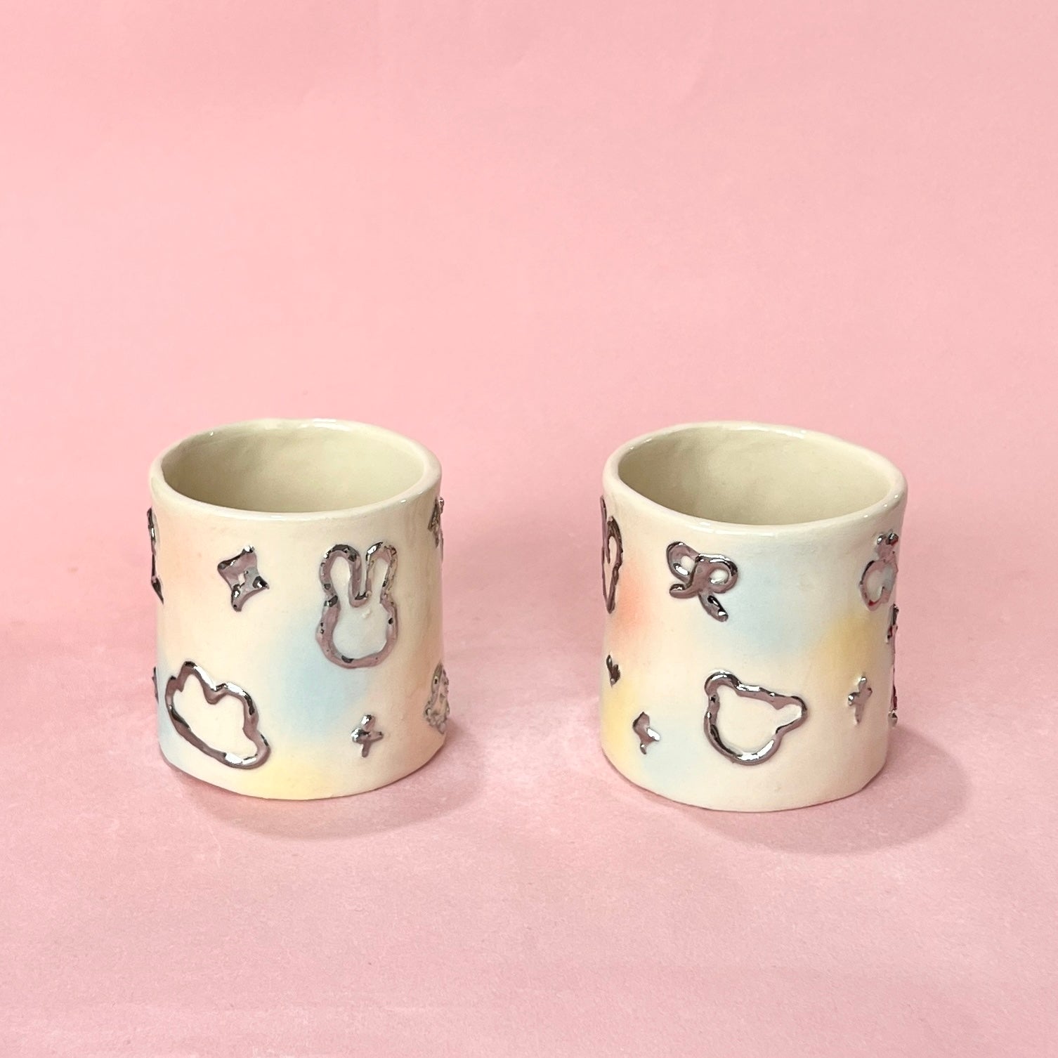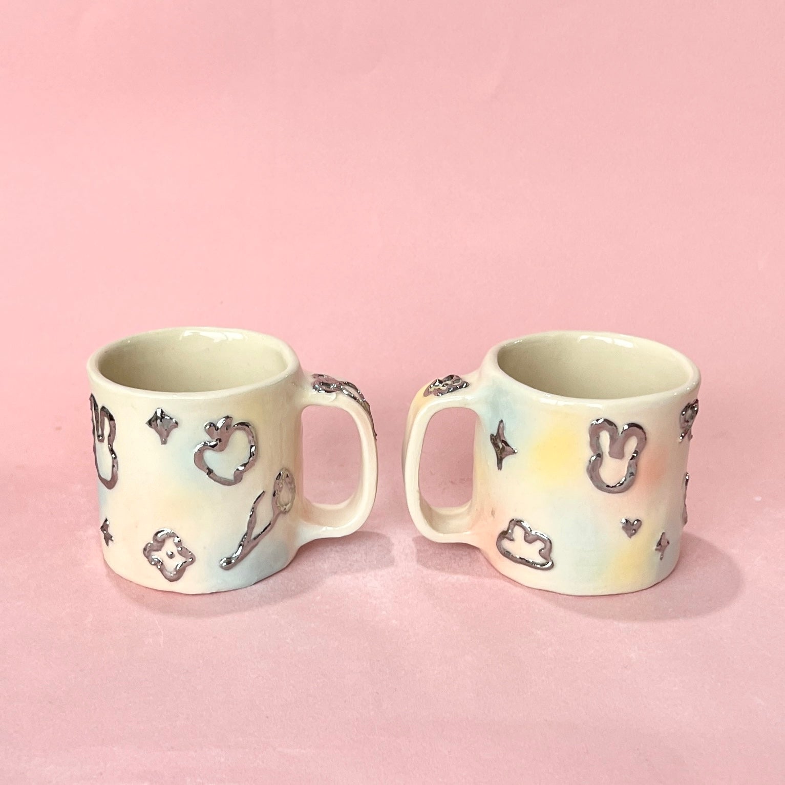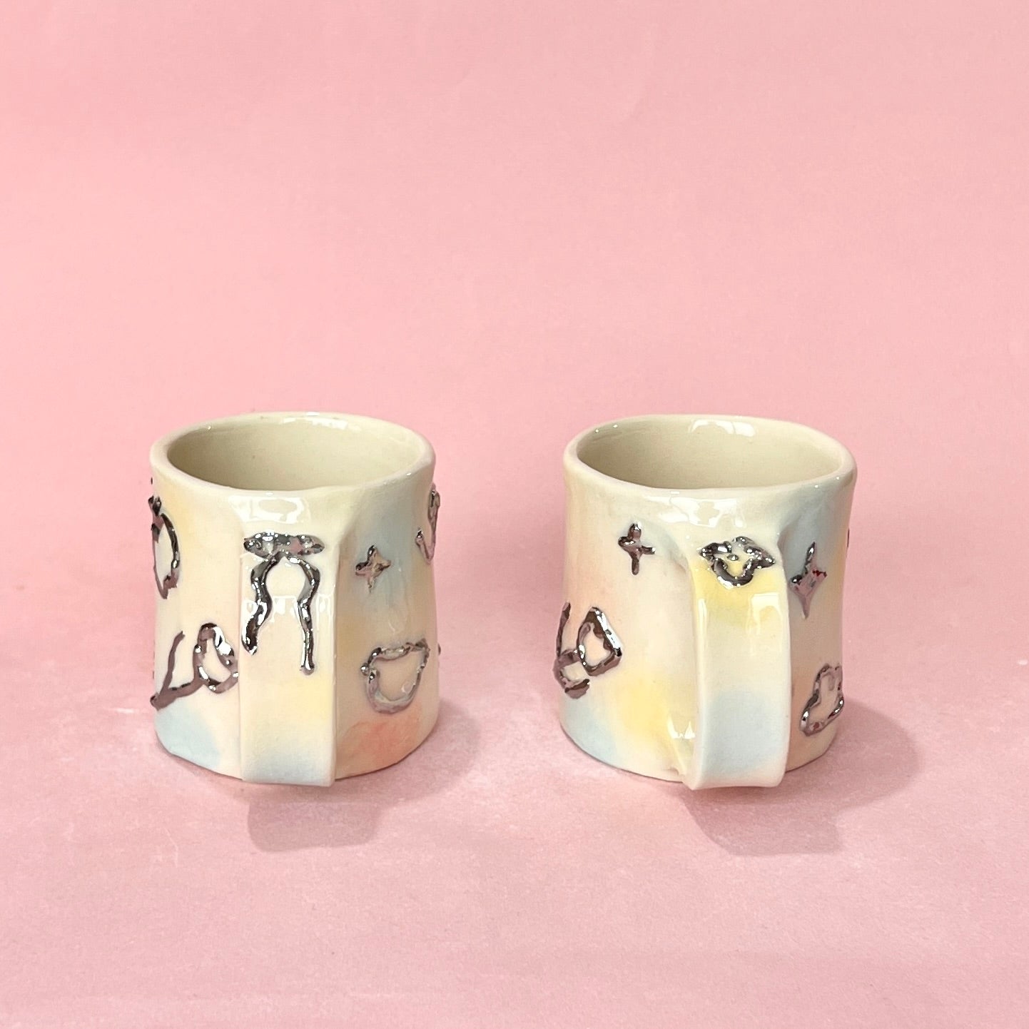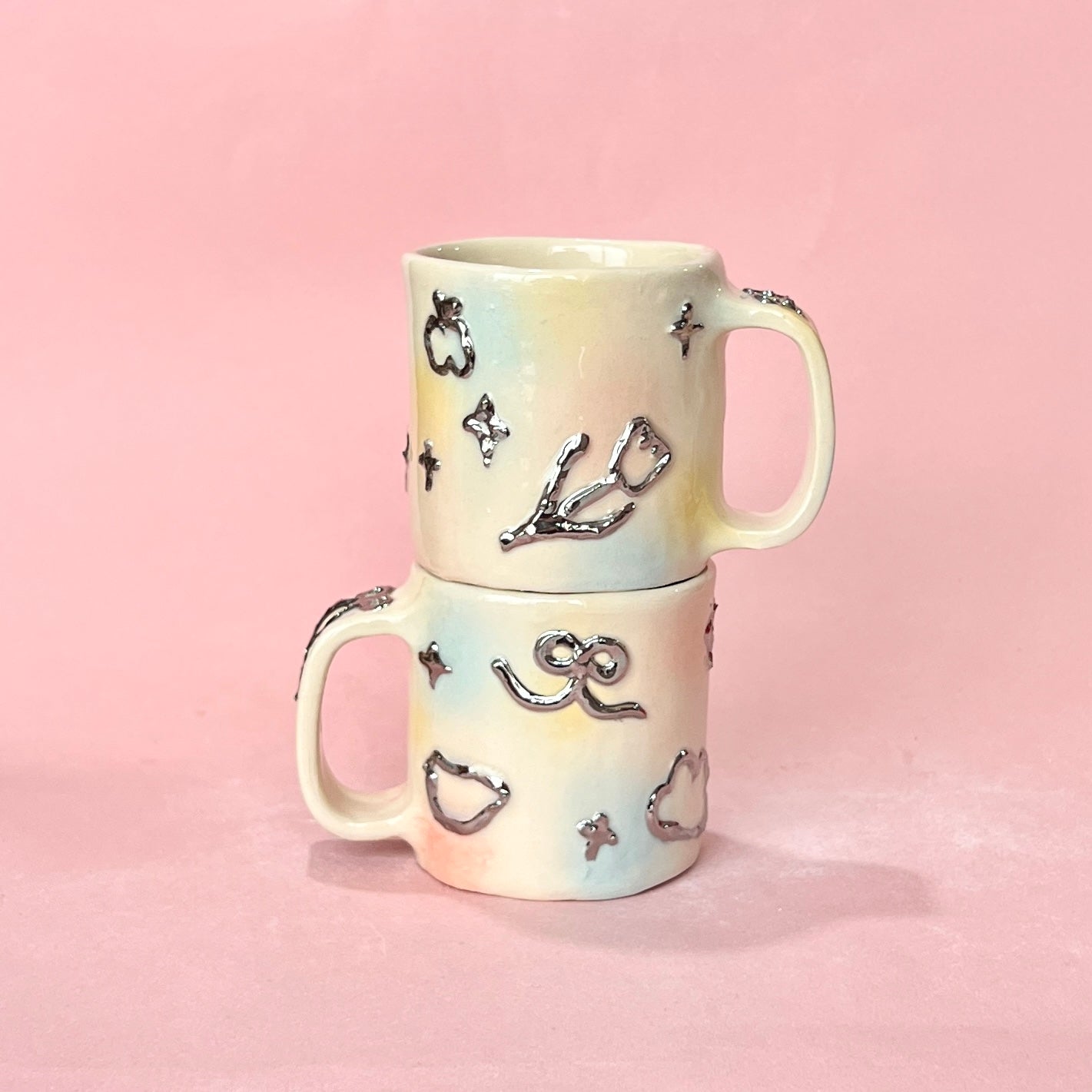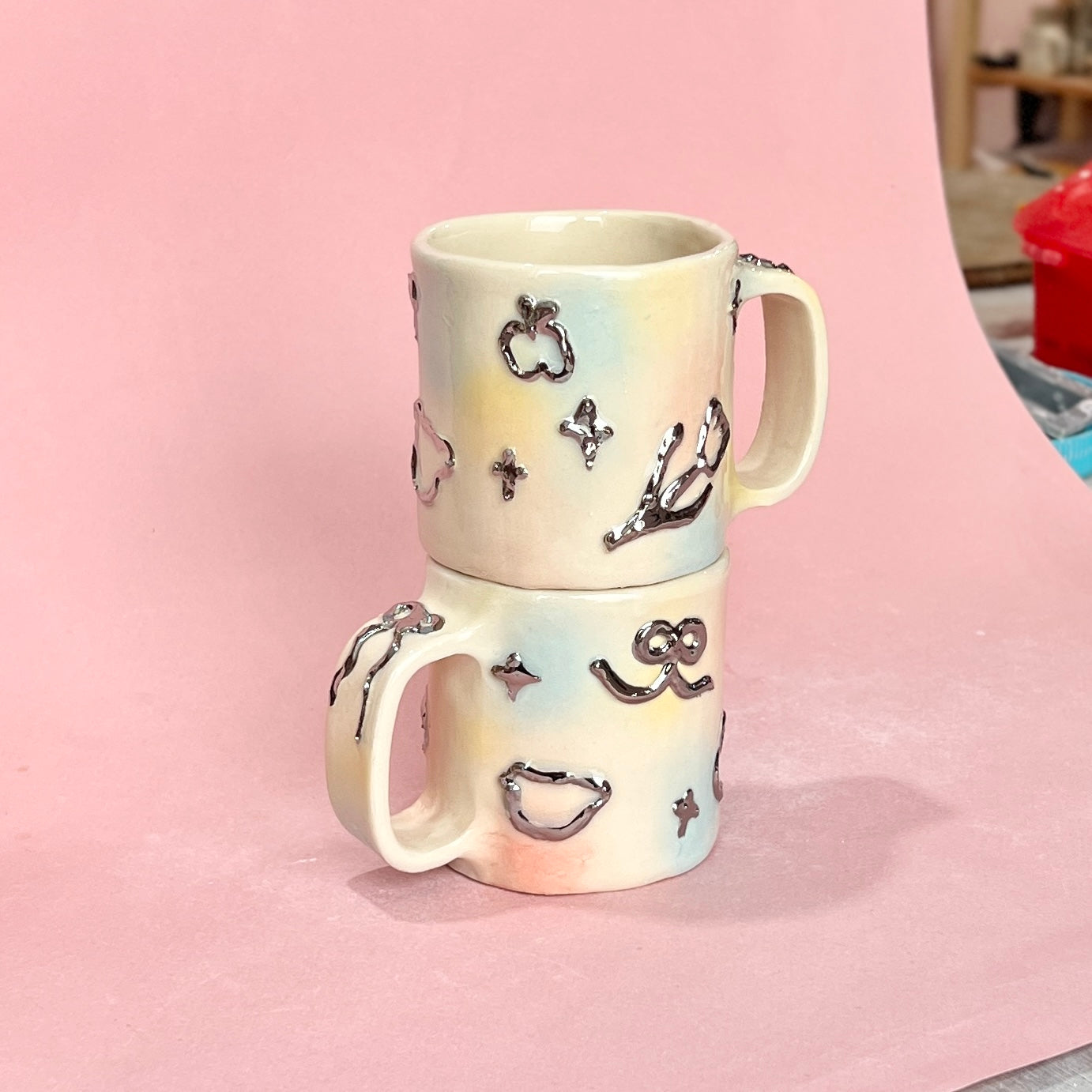 The bubblegum dream mugs are extra special mugs that have been delicately piped, airbrushed and painted before being fired twice. I've then applied platinum lustre and fired them for a third time