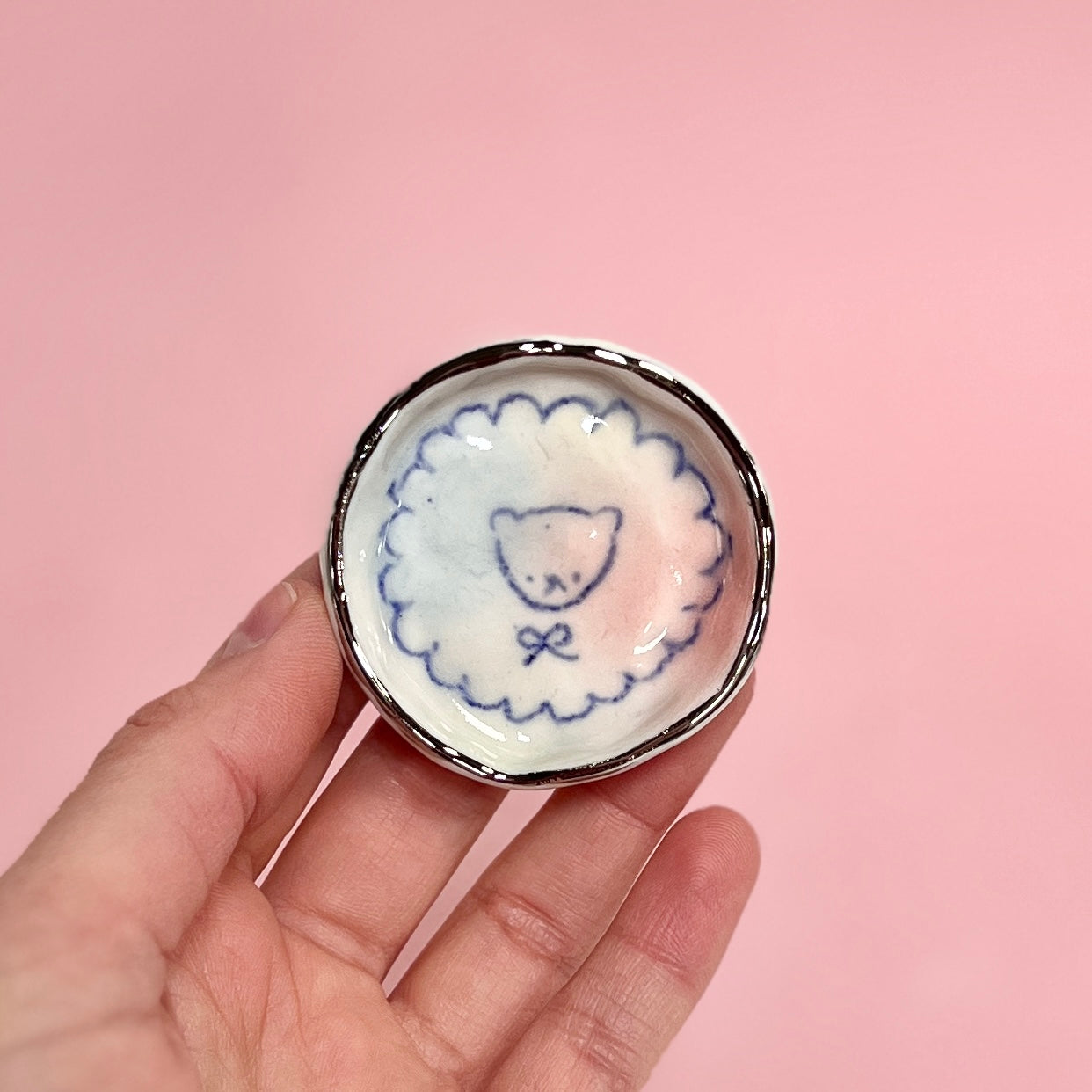 This piece has been fired for a third time with platinum lustre and dishwashing isn't recommended - the lustre will scratch off over time in the dishwasher