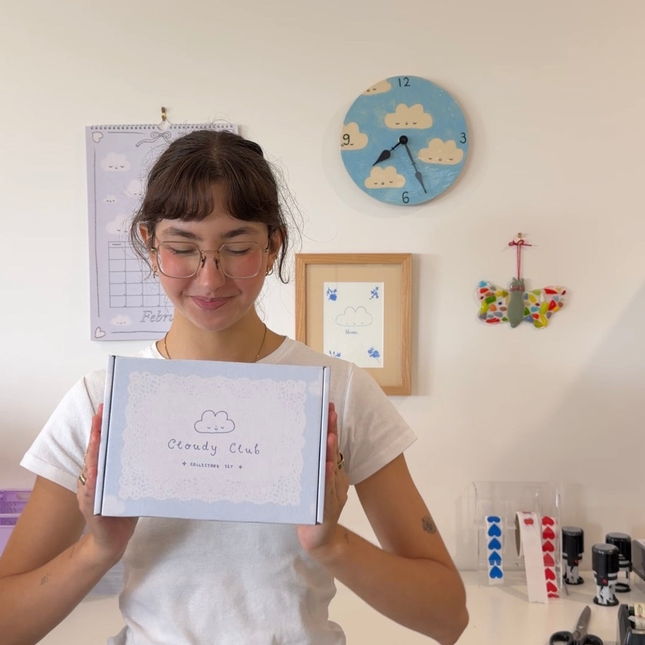 Each Cloudy Club includes a heartfelt letter, an exclusive sticker, journal prompts, a monthly playlist and a A6 postcard print to inspire connection, self-love, and creativity