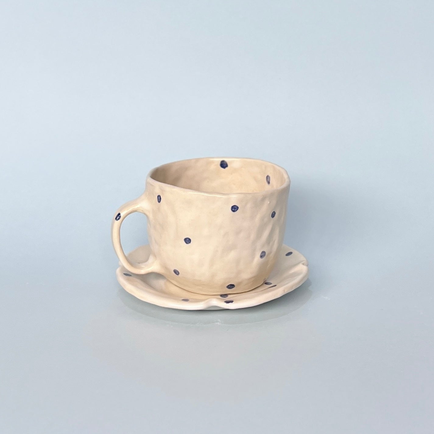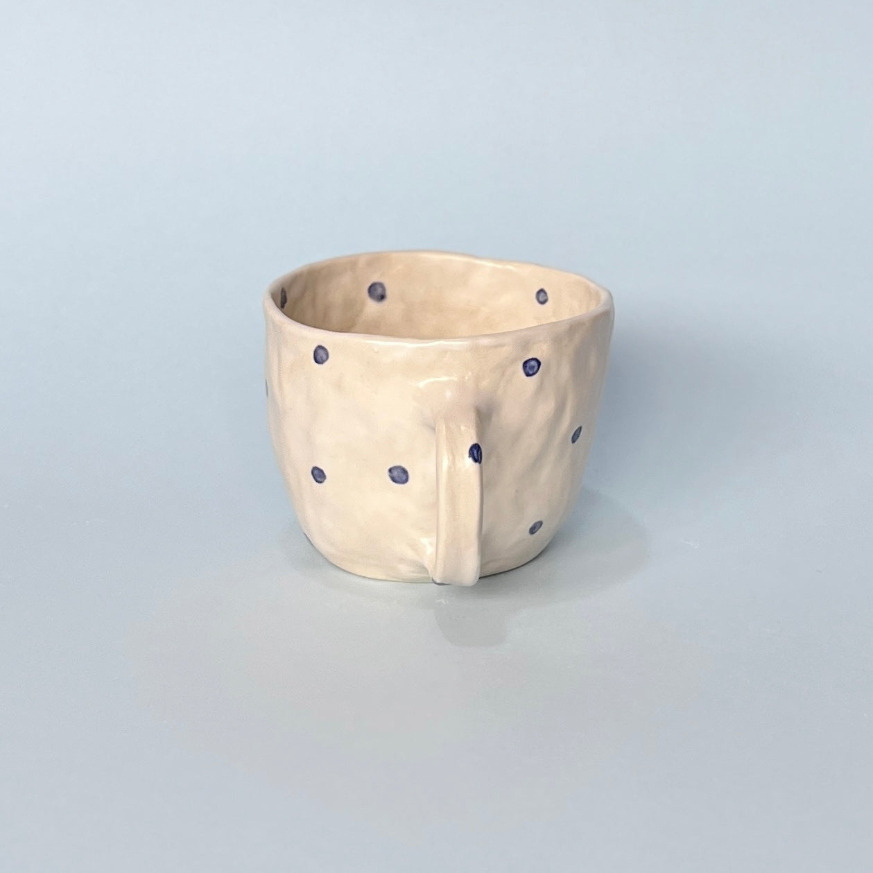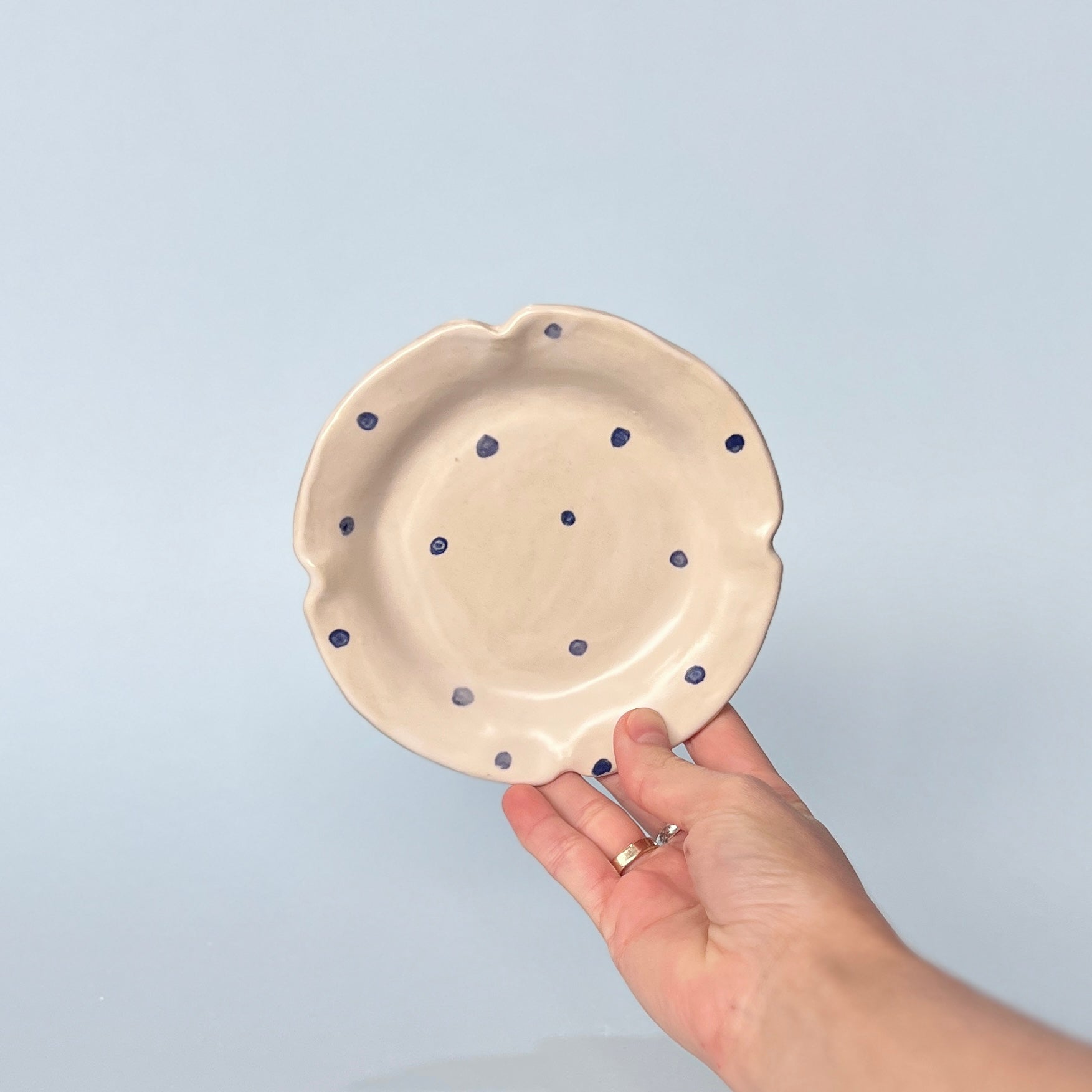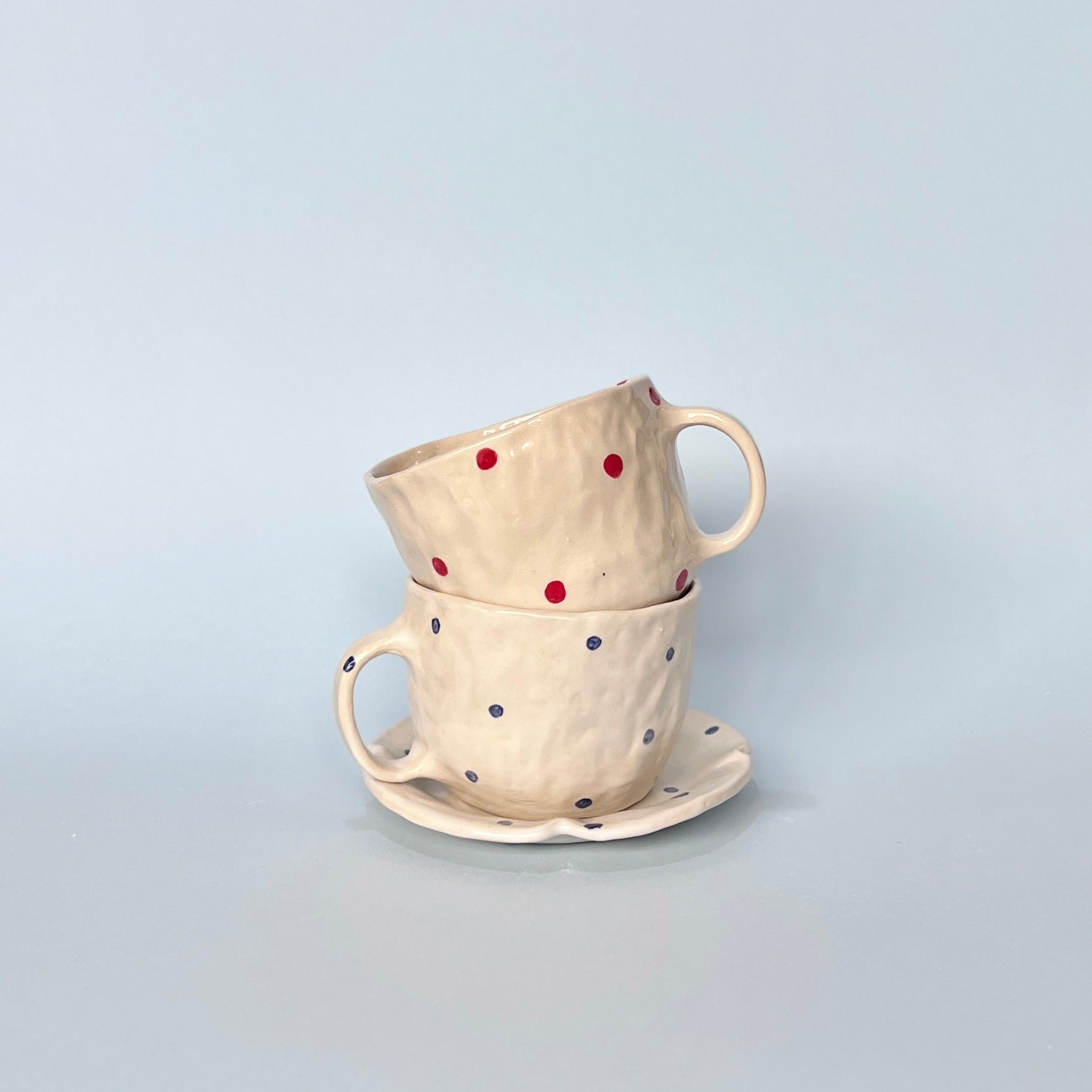 Navy spotty pieces are glazed in a milky pearl glaze making them a satin finish. Red spotty pieces are finished in a clear gloss for best colour payoff. Please note all pieces are handmade individually and so they may vary slightly in size