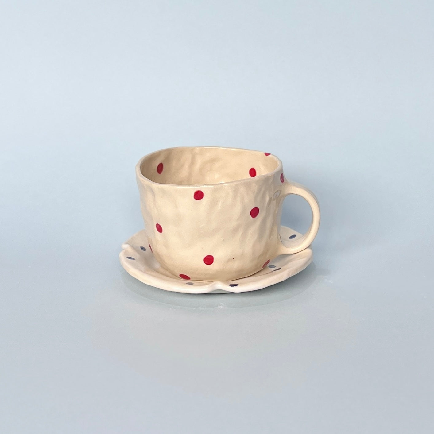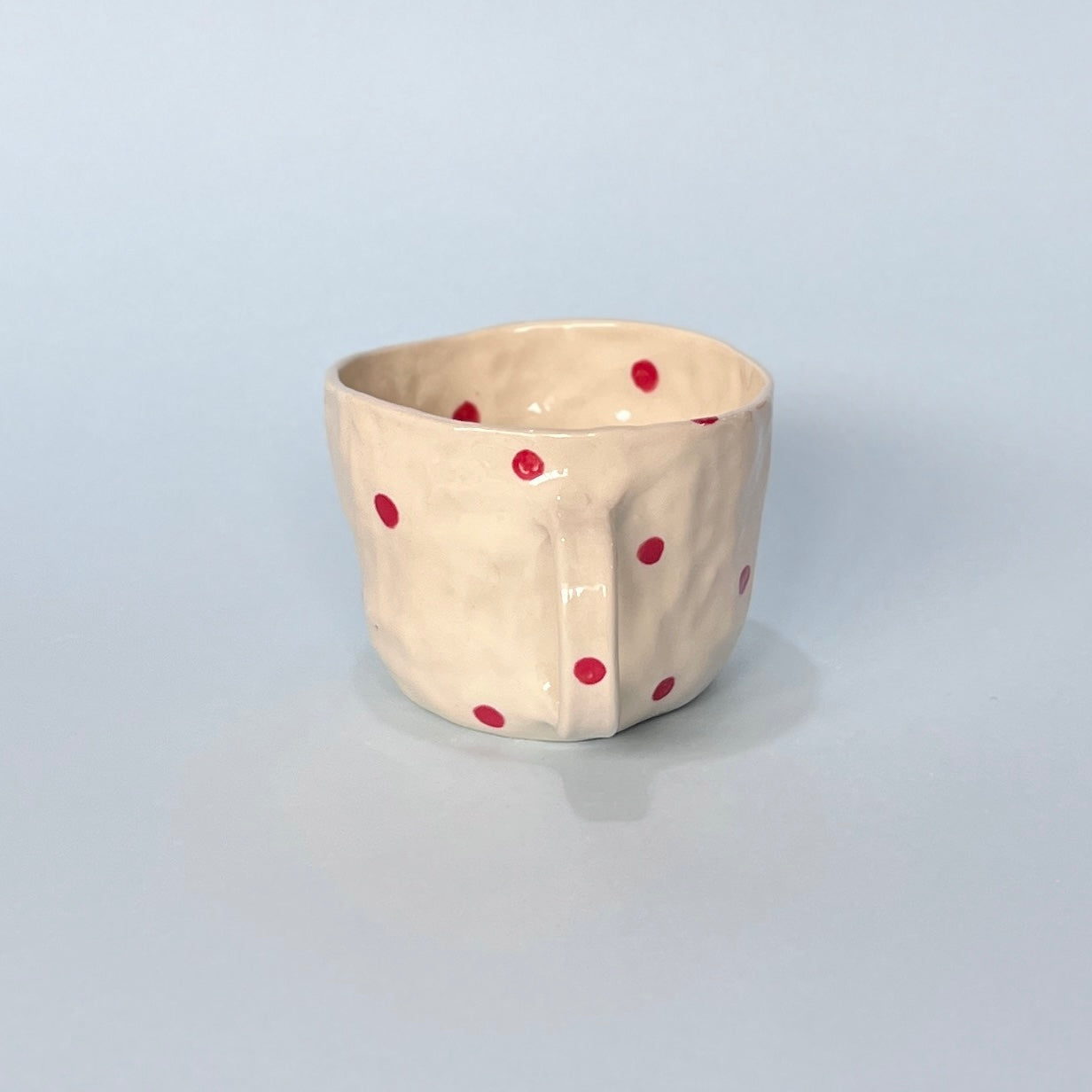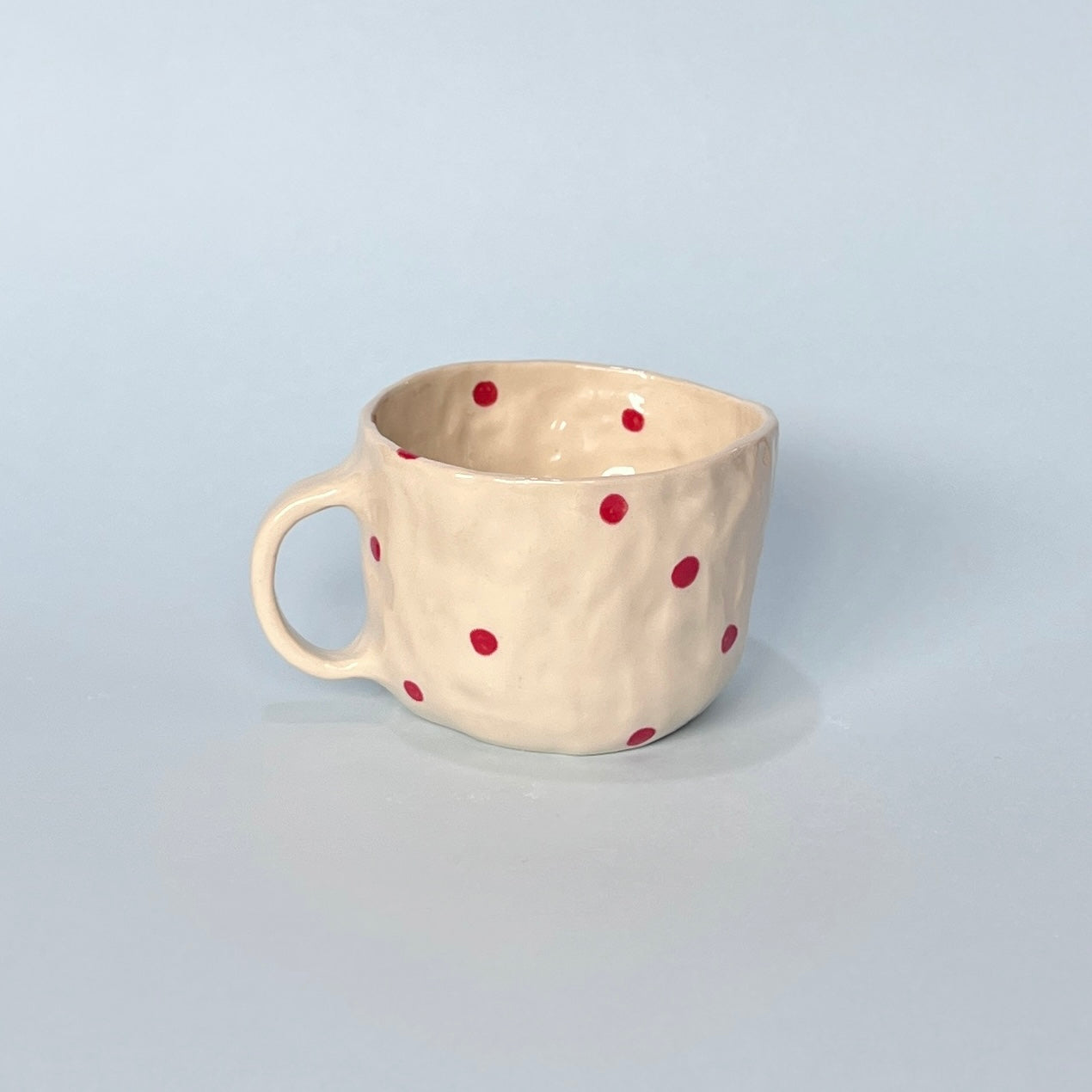Navy spotty pieces are glazed in a milky pearl glaze making them a satin finish. Red spotty pieces are finished in a clear gloss for best colour payoff. Please note all pieces are handmade individually and so they may vary slightly in size