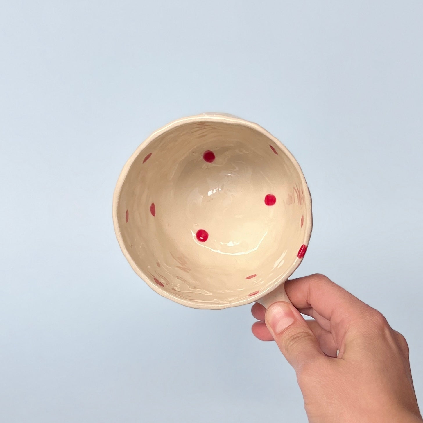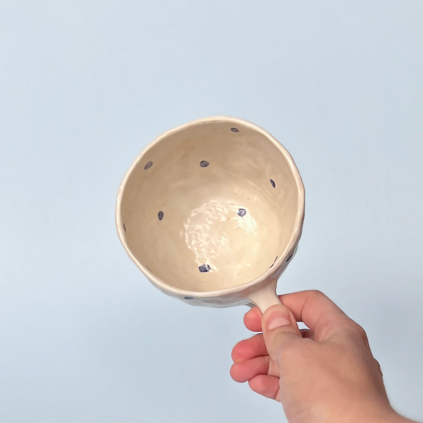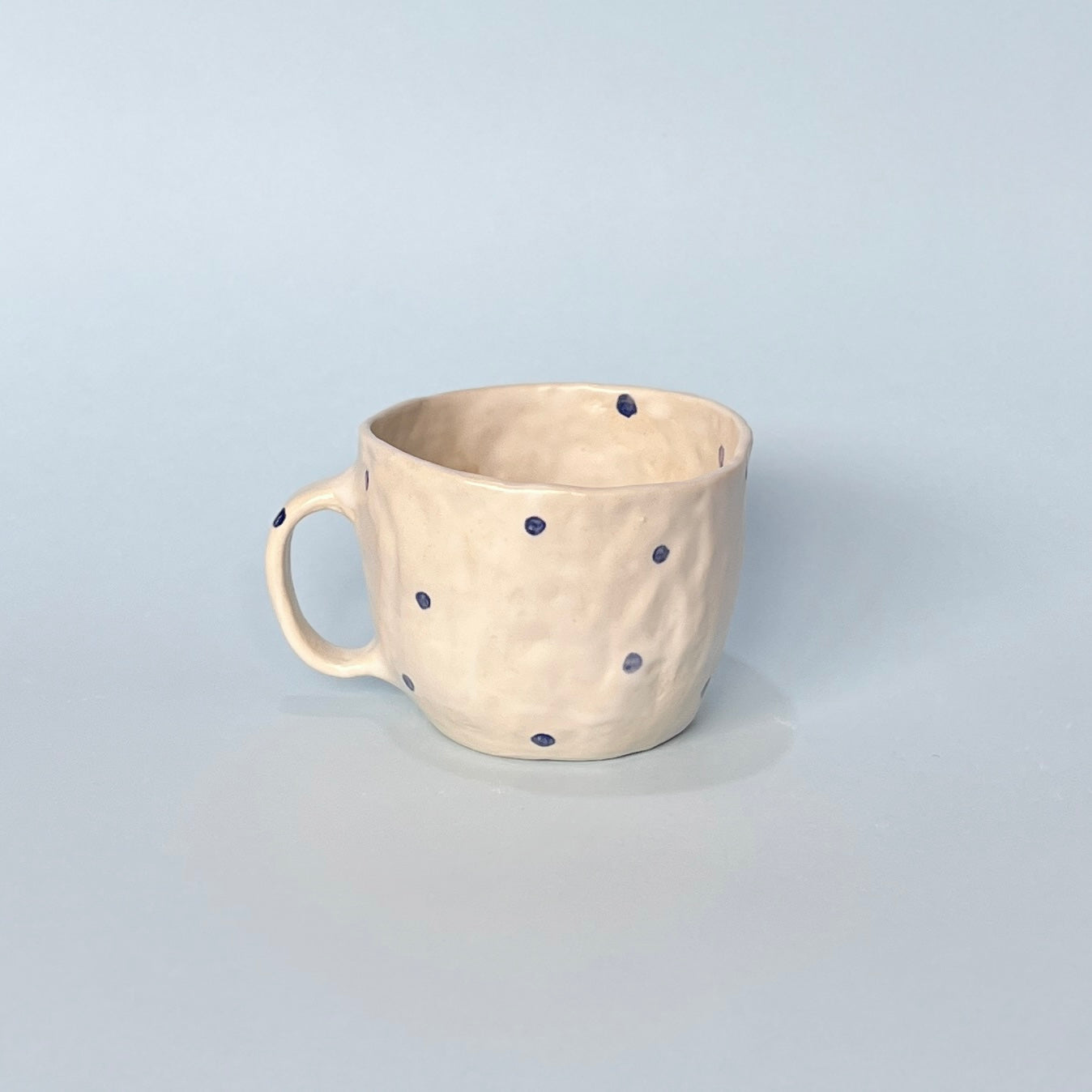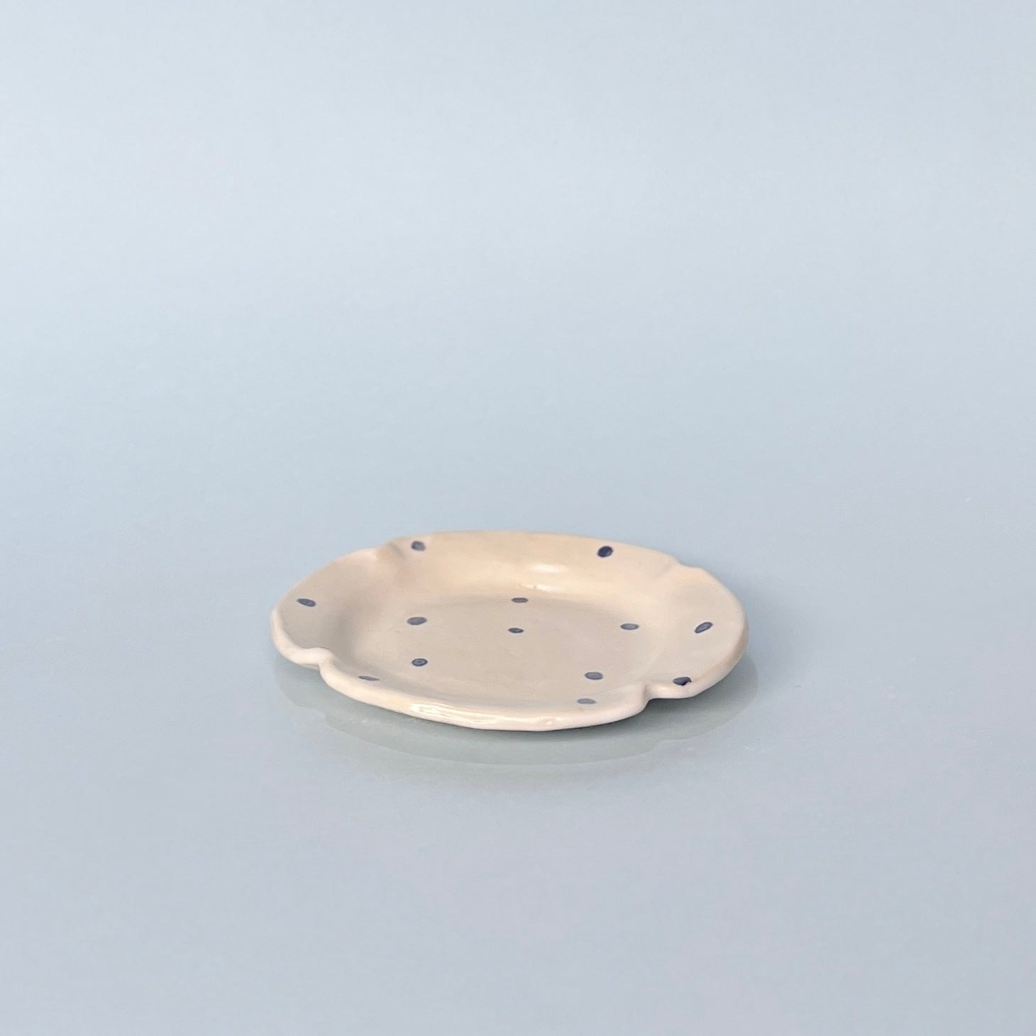 Navy spotty pieces are glazed in a milky pearl glaze making them a satin finish. Red spotty pieces are finished in a clear gloss for best colour payoff. Please note all pieces are handmade individually and so they may vary slightly in size