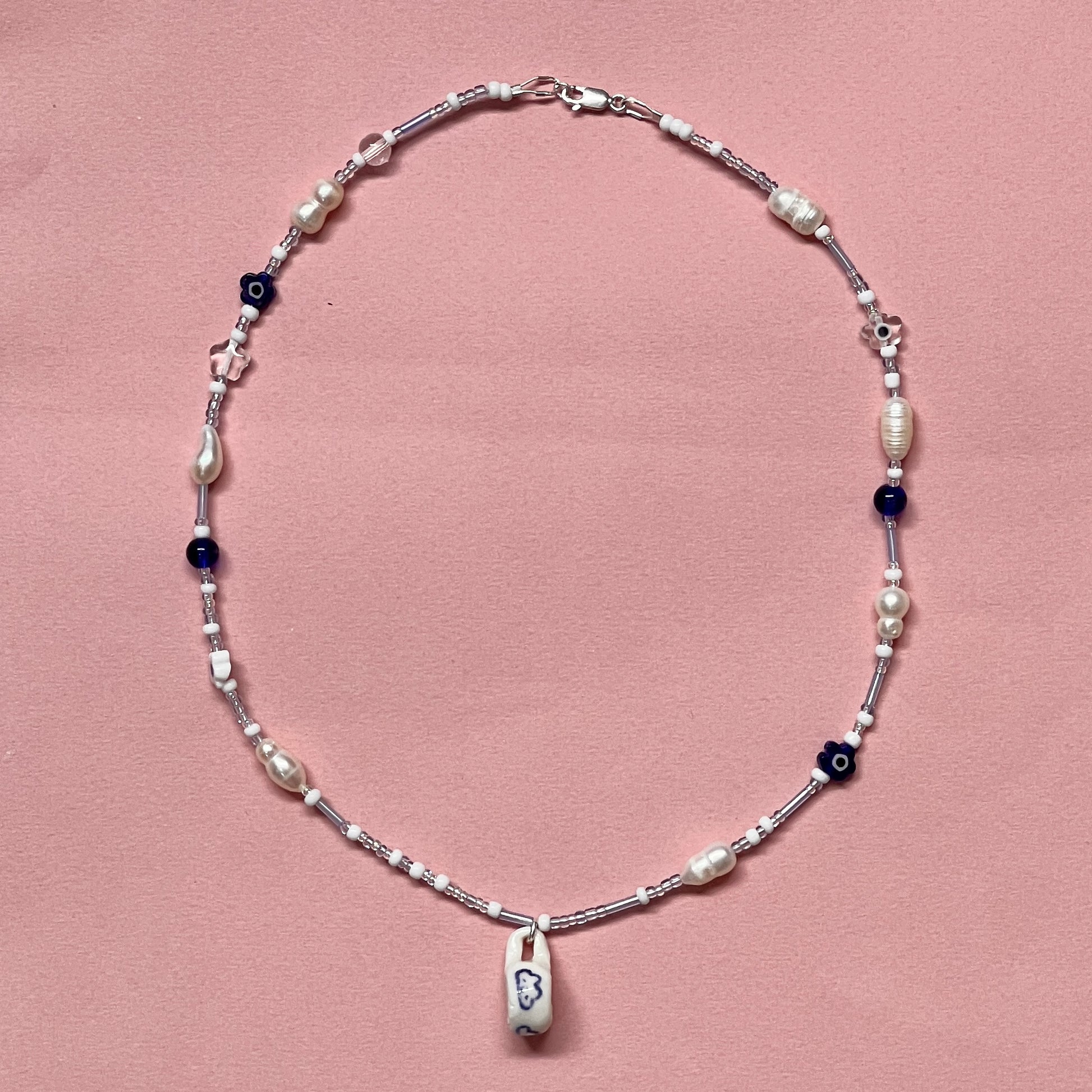 Freshwater pearls and glass beads finished with sterling silver necklace clasps and findings, strung on nylon coated sterling silver wire